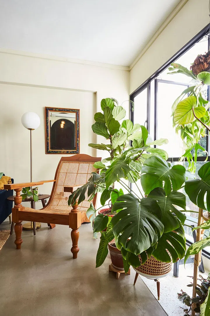 Off-white walls, arched doorways and concrete screed floors form a muted yet elegant backdrop in the living room that allow the eclectic style of the home to really pop. Vintage Scandinavian furniture like their sideboard exist alongside a royal blue velvet sofa and an outsized rattan lounge chair close to the windows.