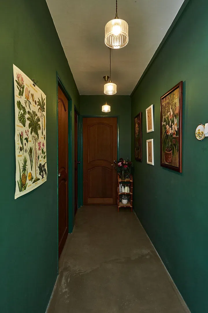 Instead of overcompensating for the lack of light, Marvin and Lingyi chose to embrace it, pressing on with the dark colour scheme and keeping artificial illumination to a minimum. For instance, the walls of their hallway were painted a shade of forest green and warmly lit with a trio of delicate pendant lamps. Nicknamed their “floral corridor”, it is decorated with frames of vintage pressed flower art and paintings of orchids by Lingyi’s grandaunt, the artist Lim Chu Suan.