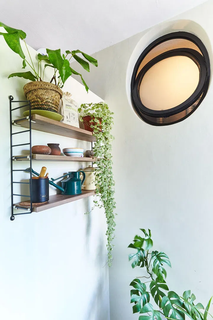 A simple wall-mounted shelf is used as a handy display case next to the indoor garden.