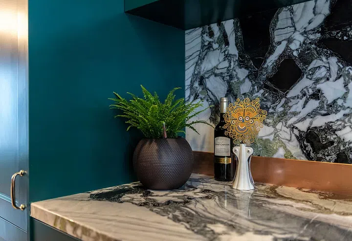 Arjan gave the kitchen dark rich green cabinetry; the grey, white and green marble brightens the space, while brass handles and a copper backsplash add a touch of luxury.