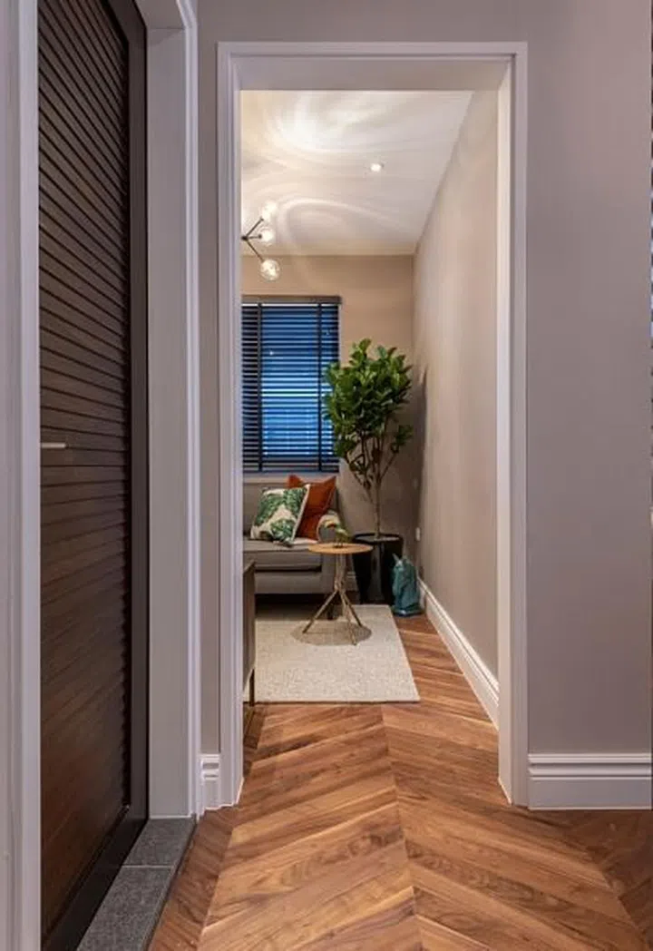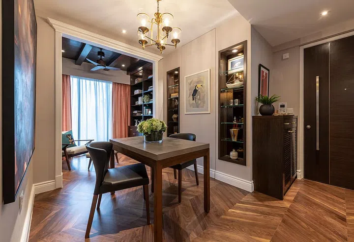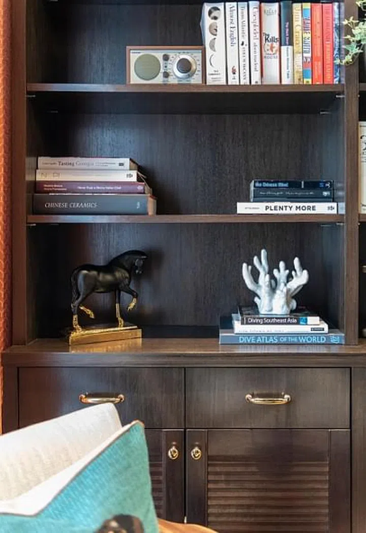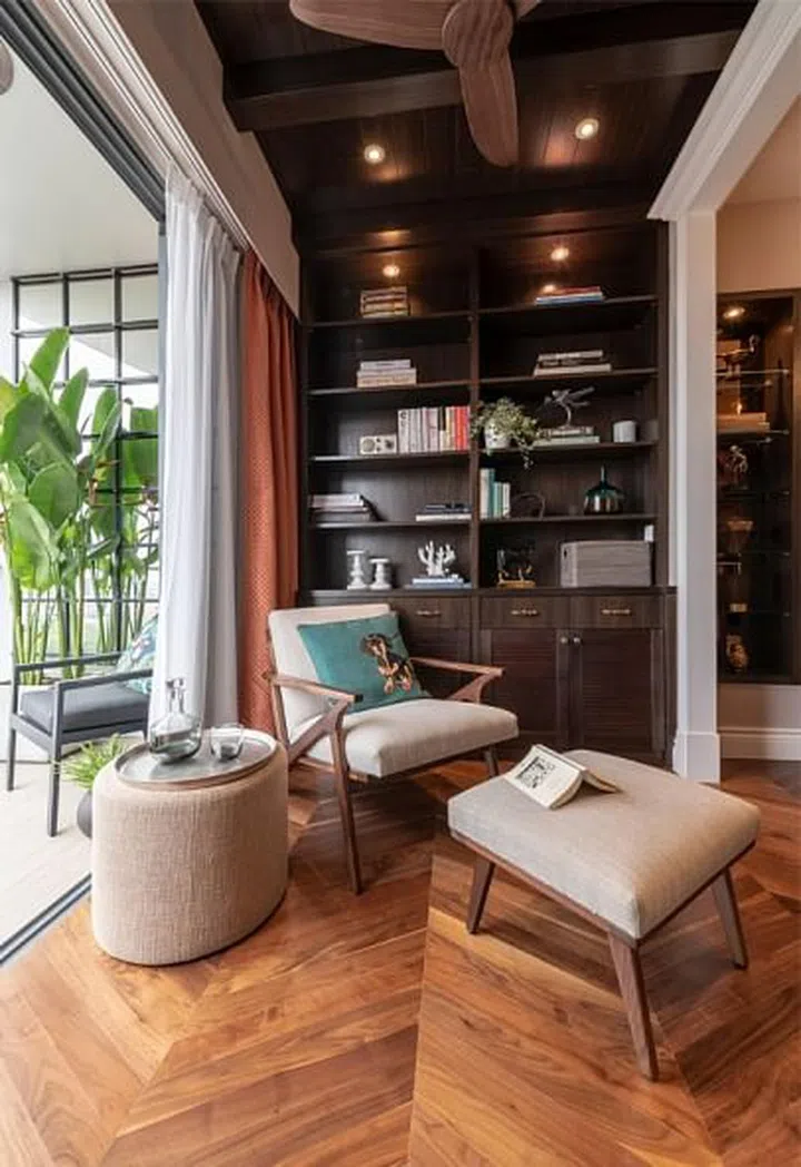 A large bookcase, in a dark finish, which complements the chevron American walnut flooring, houses the owner's books and knick knacks.
