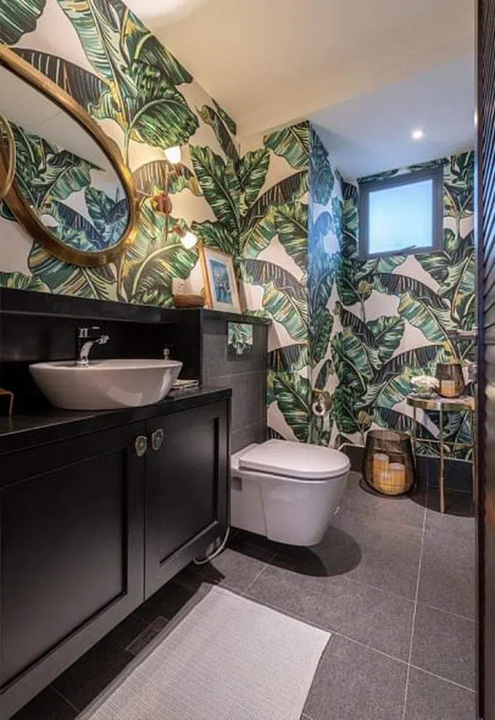 To emulate a tropical landscape, the designer customised a Banana Leaf printed wallpaper for the powder room.