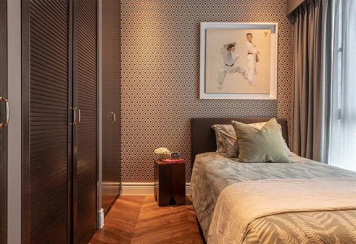 The master bedroom rocks a bold geometric pattern wallpaper. "I offset this with dark louvred wood doors and rich textures in the curtains. Orange and teals work hand in hand with dark woods and taupes – picking up the colours in the artwork and photography pieces in the space," shares Arjan.