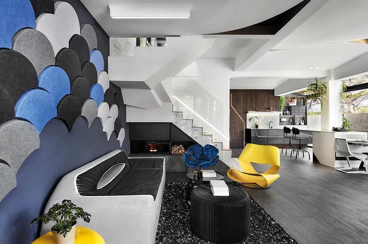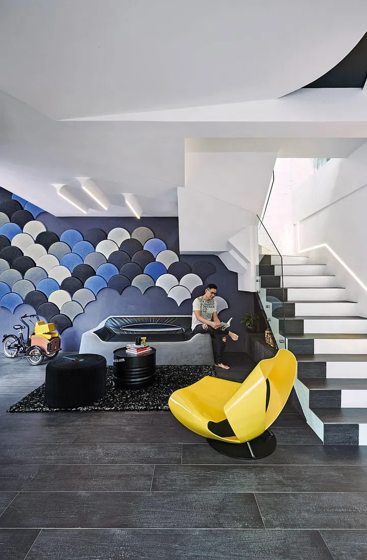 Past the main entrance, Kelvin overhauled the entire layout of the ground floor, creating an open-concept communal space with a “fireplace” cabinet beside the sofa, and used acoustic wall panelling with a fish scale pattern for the feature wall.
