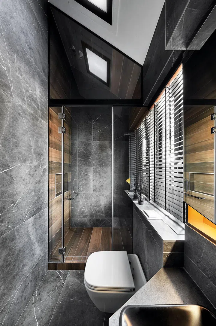 The floor, wall, vanity and door panel of the bathroom use the same material for harmony.