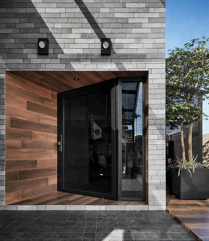 The main entrance is through a wooden alcove with a large steel and glass door fitted at an angle. The wood pattern warms up the grey.