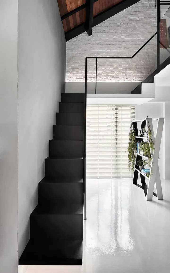 The staircase, fashioned out of an ultra-thin metal sheet folded into steps, and the sculptural bent steel handrail, transform this space into a work of art.