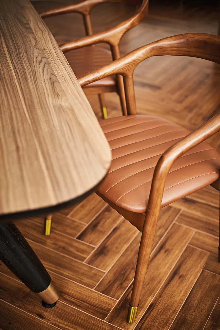 The dining table and chairs in front of it were sourced from Taobao. Calvin reupholstered the chairs with leather and added brass caps onto the legs.