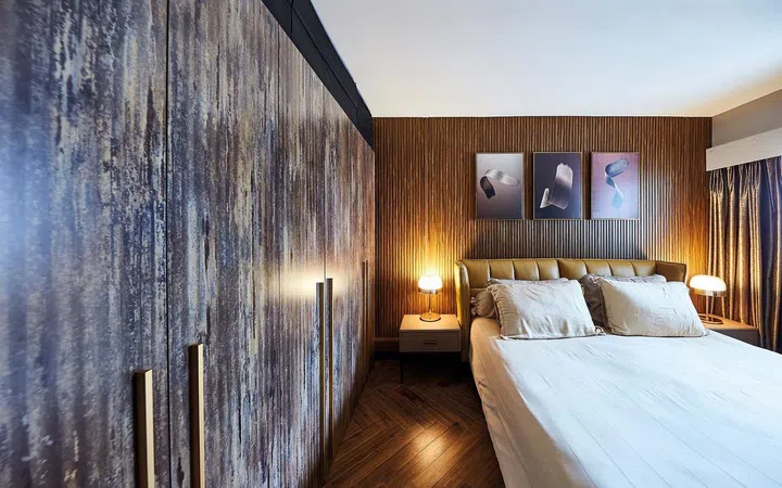 The bedroom sports a dark material palette, comprising leather, timber and dusky pink accent while the master bathroom features all-white tiles in various modular shapes.