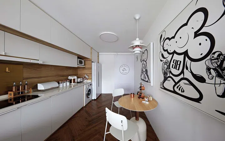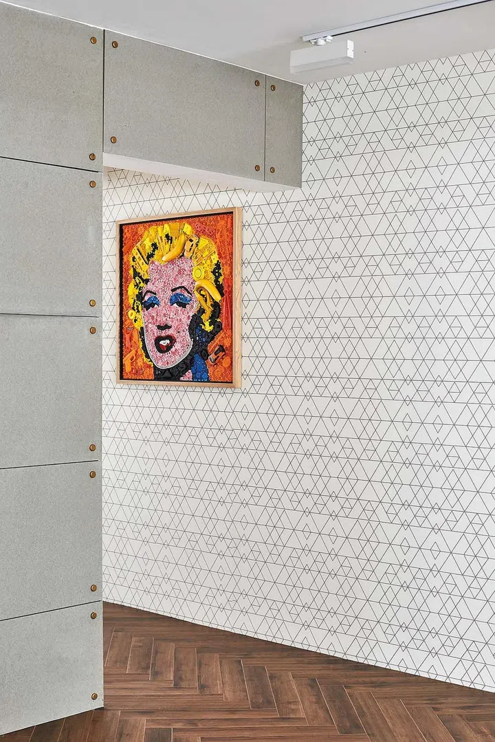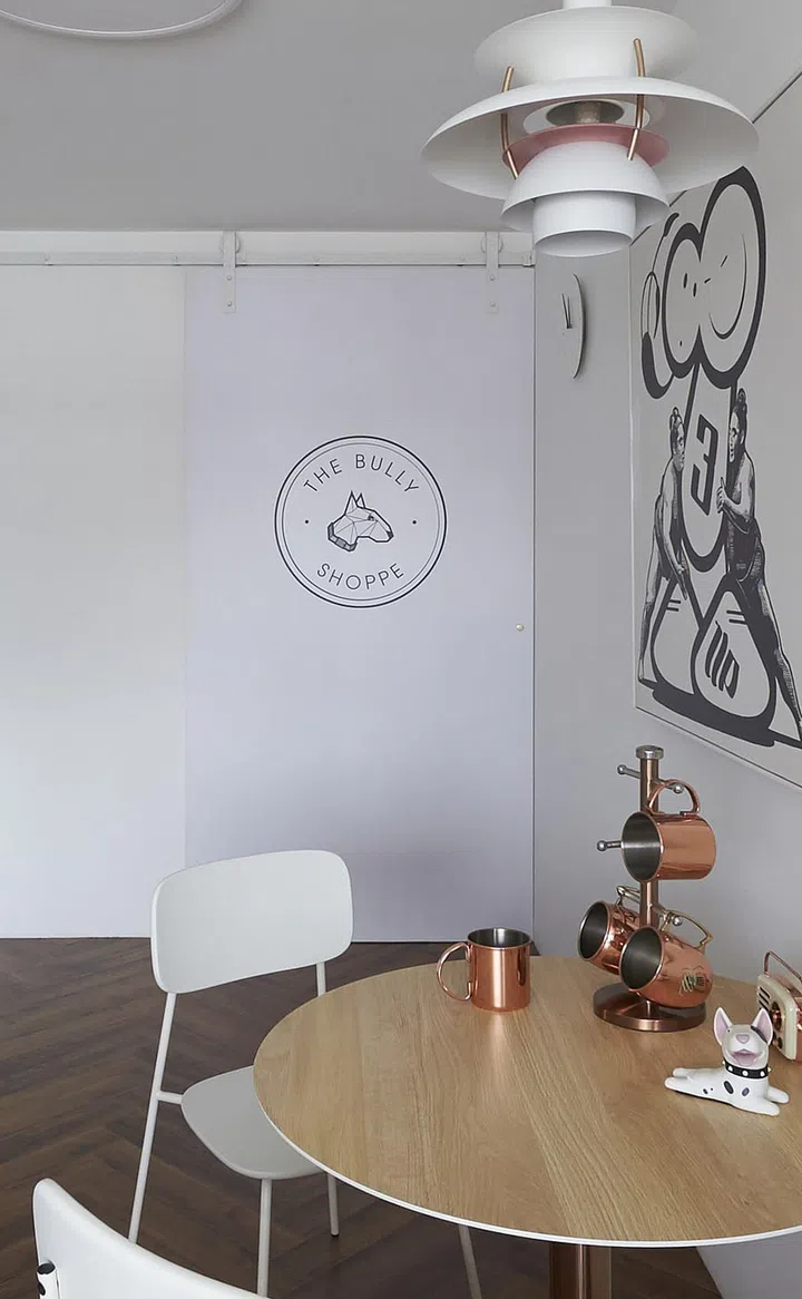 The decal on the sliding door and the graffiti artworks by The London Police printed on canvas lend a graphic touch.
