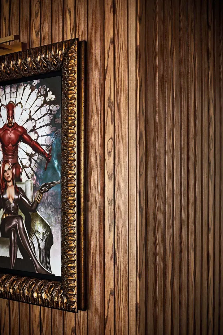 The dark engineered wood wall finish, the ornate frame of this Daredevil and Black Widor artwork, and the dark light switch create a sumptuous material palette.