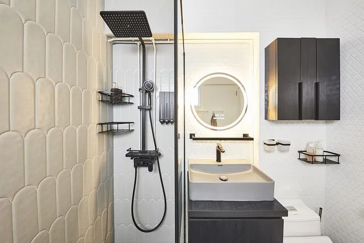 The light grey, scalloped tiles of the shower provide a subtle contrast with white triangle tiles of the bathroom.