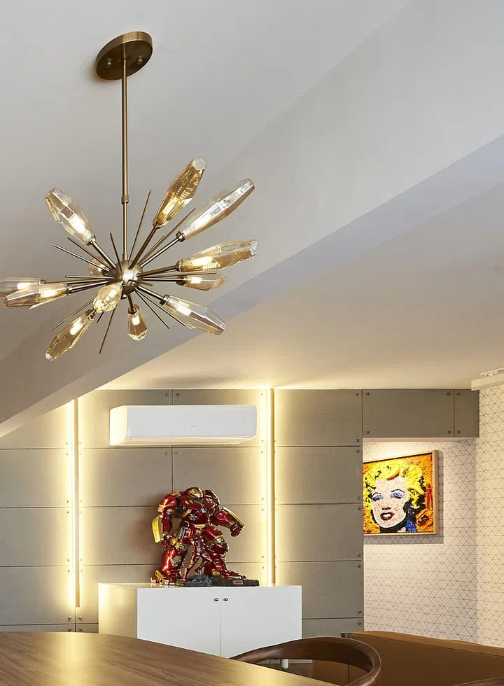 The ceiling lights in the living and dining area are track lights, which work in tandem with the wall lights – two horizontal bars that Calvin rotated and installed vertically – to create museum-quality illumination.