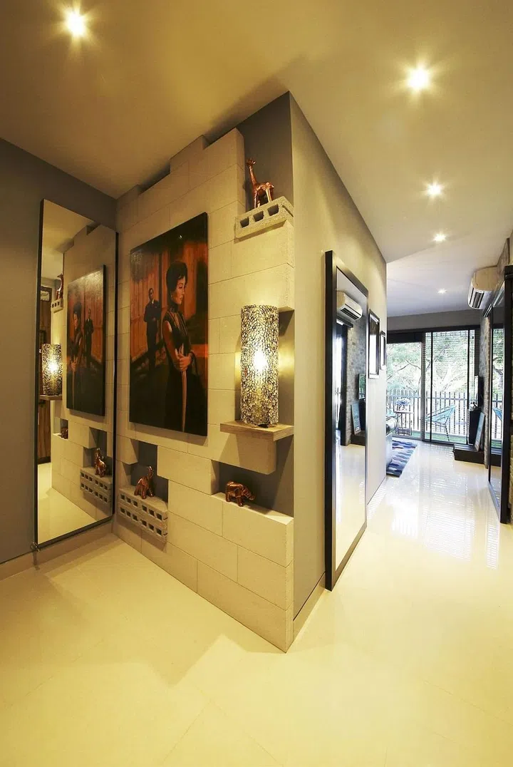 He also incorporated lots of mirror panels in the home, to reflect more light and visually enlarge the space. The mirror panels are used to conceal the shoe cabinet, bomb shelter and the entrance to the bedroom.