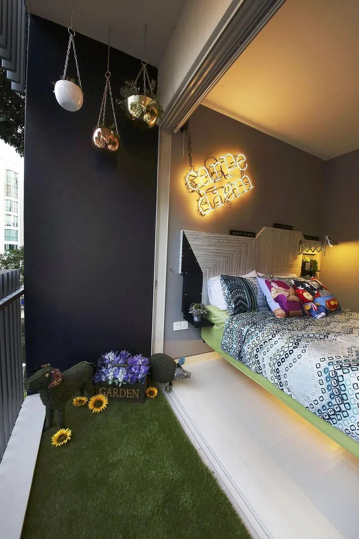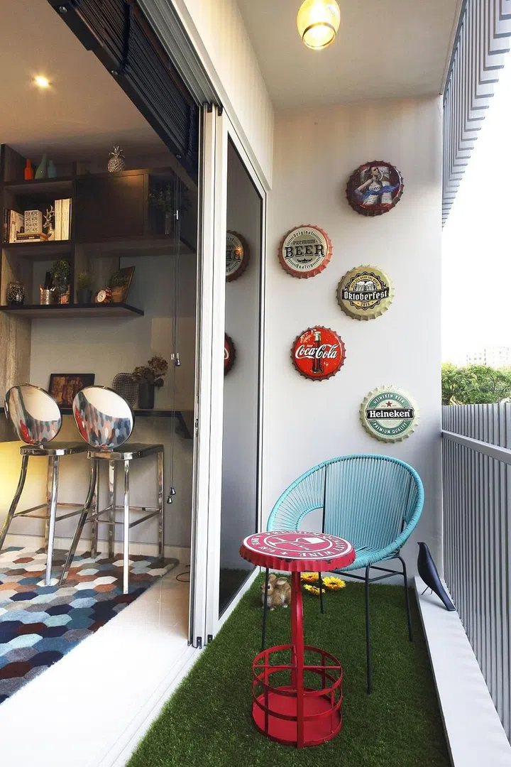 The balcony was laid with artificial turf, and decorated with an old-school chair, vintage-look side table and wall decor.