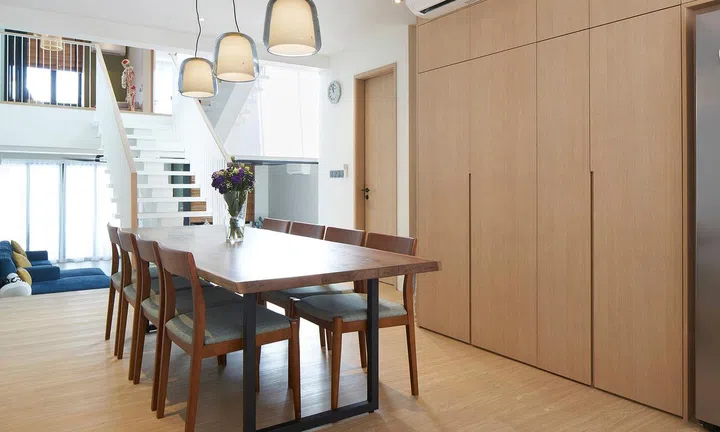 The wood dining table was customised from Grey and Sanders, and complemented with dining chairs from Castlery.