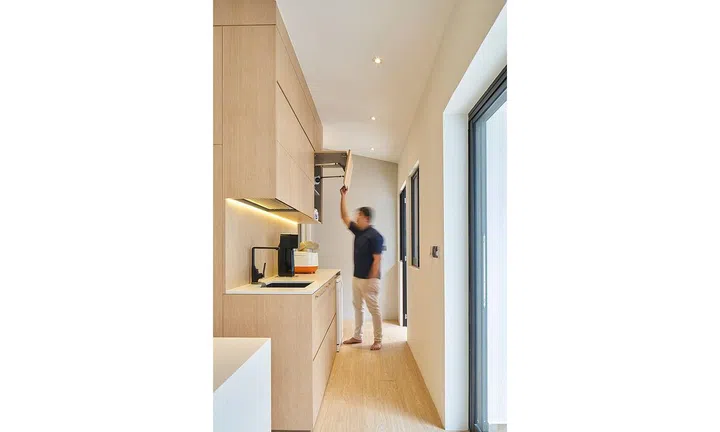 "The selected materials were light wood flooring, light wood cabinets, white and grey walls, and white marble-look quartz tops. The interiors were kept light-coloured so light will filter through the space," Hsia Pin shares of the materials and colour palette.