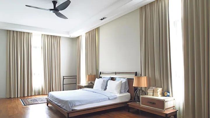 The spacious master bedroom on the second floor comes with a walk-in wardrobe, which leads into the mostly white bathroom. A standalone tub stands in the centre with his and hers vanity sinks on both sides.