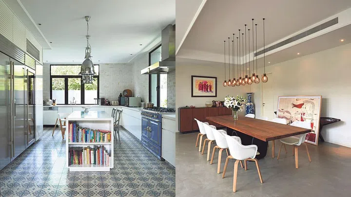 Gunjan wanted a New York-style kitchen, with an island-cum-dining table in the centre and a display for cookbooks on the side. To go with the look, the walls were plastered with brick tiles painted white, while the floors were lined with Peranakan tiles.