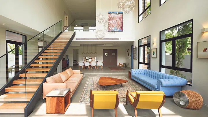The double volume living room gets plenty of natural light and breeze, and when the doors to the garden are left open, ''you almost forget that you are indoors,'' says Gunjan.