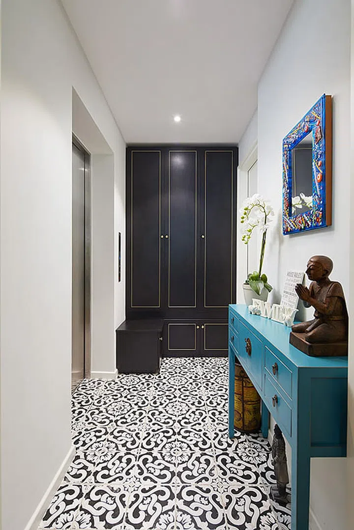 Step out of the lift and you’ll be instantly welcomed with this stylish foyer. Its dark floor-to-ceiling cabinet plays well in contrast to the patterned floor tiles, while the blue traditional-style sideboard gives the space a pop of colour.