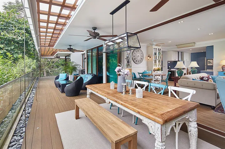 The traditional theme follows through to the patio, complete with contemporary touches like the sleek pendant lamp.