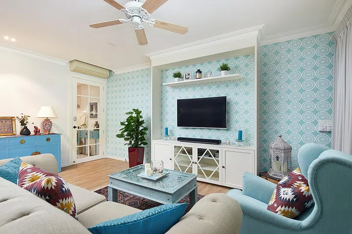 Clad in a gorgeous light blue motif wallpaper, the feature wall will catch your eye the moment you enter the living room