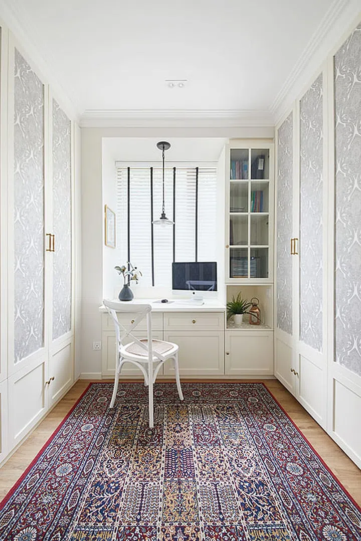 The master wardrobe cum study is a luxurious enclosure, fitted with a well-lit work desk.