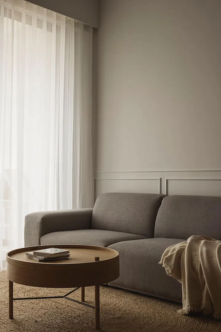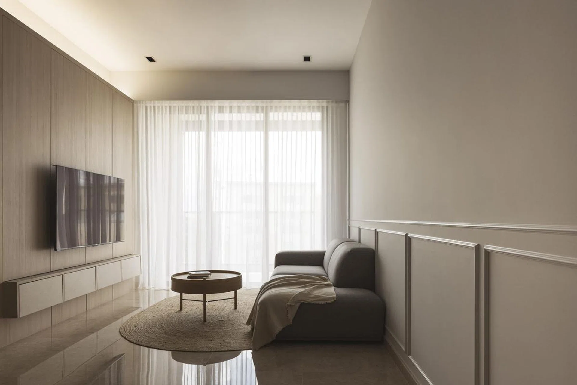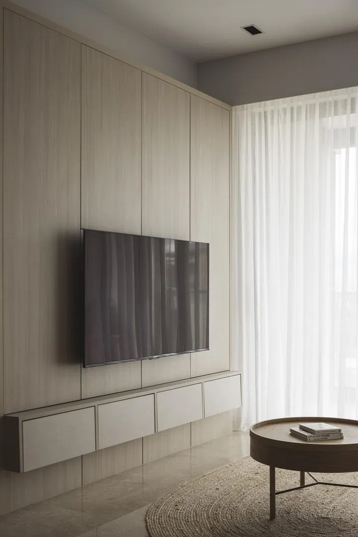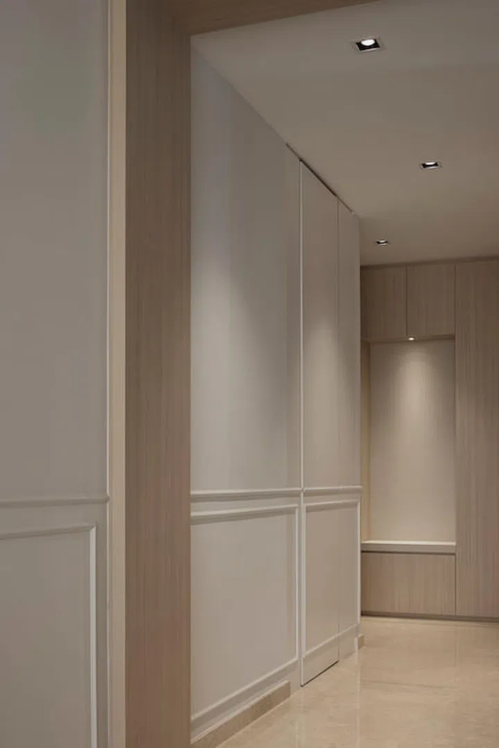 Lighter neutral hue laminates are selected for Living and Dining, and the darker tones for the Bedrooms. Half wall mouldings were also added, bringing some subtle classic details and character within the various spaces.