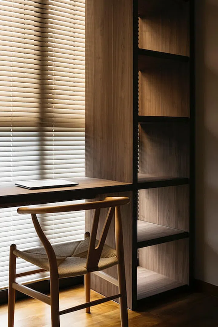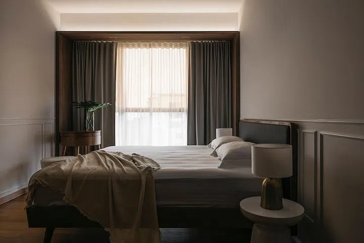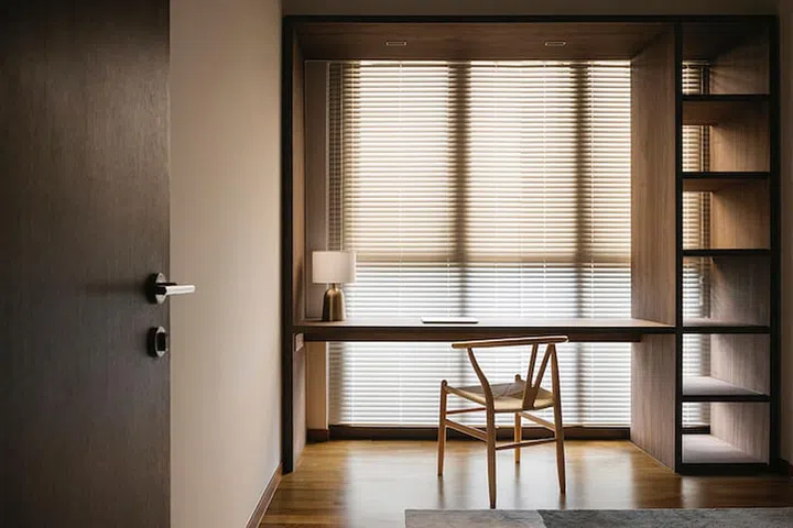 "The biggest challenge was working with the half tinted film on the existing windows. With an intense half-warm tint casting into the bedroom throughout the day, the spatial experience and mood for the user seems disoriented at times. The solution was to have day curtains and louvered blinds with sensitively selected finishes that can help soften this effect, creating a more soothing atmosphere for both the space and the user. A darker tone laminate was also selected to find balance with and complement the hue of the tinted cast." he explains.
