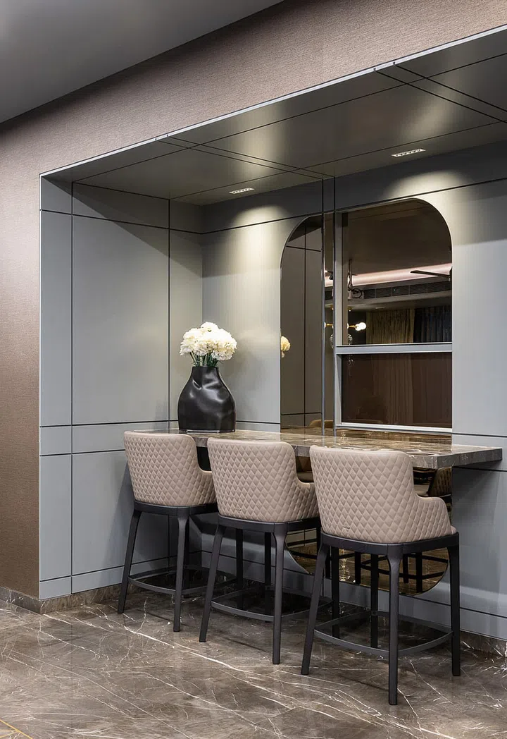 And an informal breakfast counter and bar with arched wall niche.