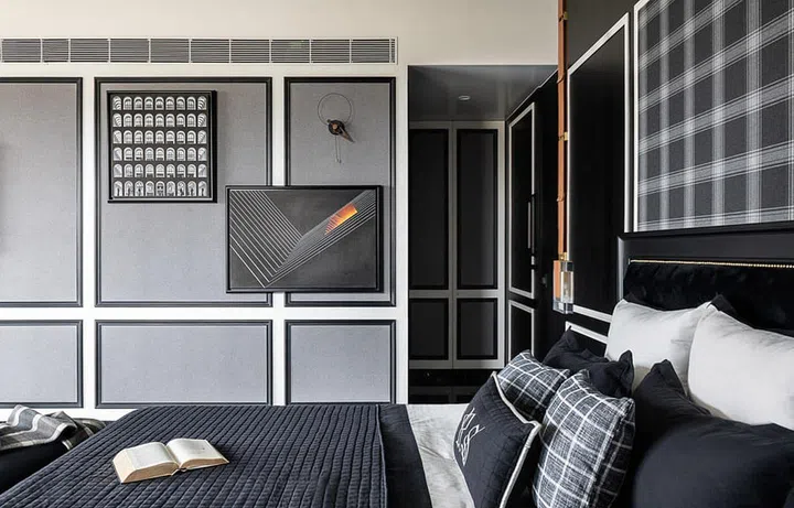 Typographic neon light adds fun into this contemporary bedroom.