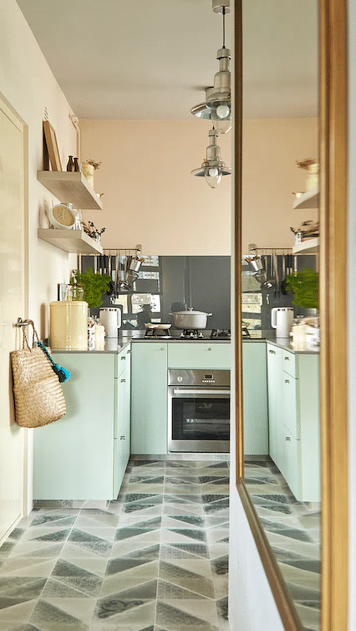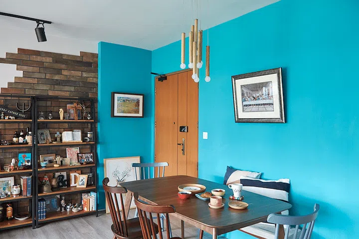 The interior of this four-room HDB apartment acted as a giant canvas for Priscilla to make a splash with attention-grabbing, yet soothing, colours. From mint green in the kitchen to turquoise in the dining area, brick-like tiles in the living room, and quirky wallpaper in other spaces, it was a bold experiment with different shades and motifs.