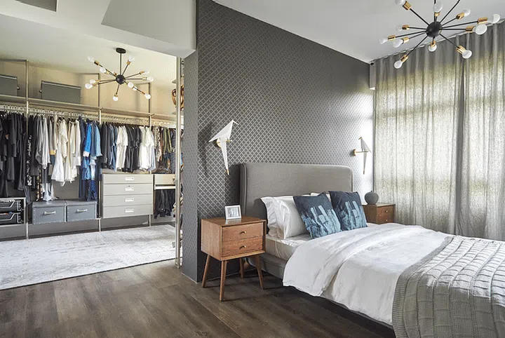 The designer jazzed up the look of the master bedroom and walk-in wardrobe with eye-catching bedside and ceiling lamps