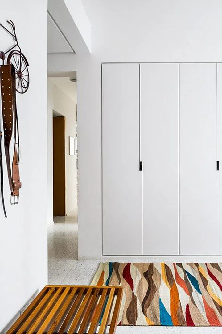 The loose furniture that fill the apartment comes in various hues, from cool (like the cabinet and area rug) to warm accents (such as the wooden pieces).