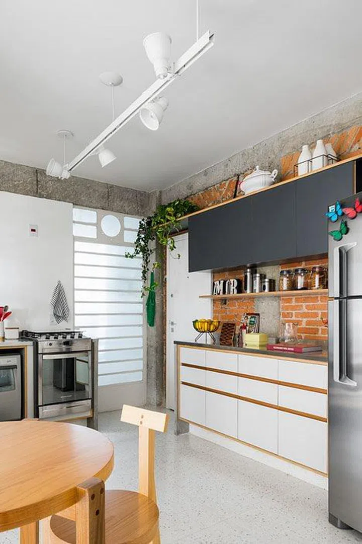 The red-toned bricks in this utilitarian-style kitchen was balanced out with monochromatic cabinets.