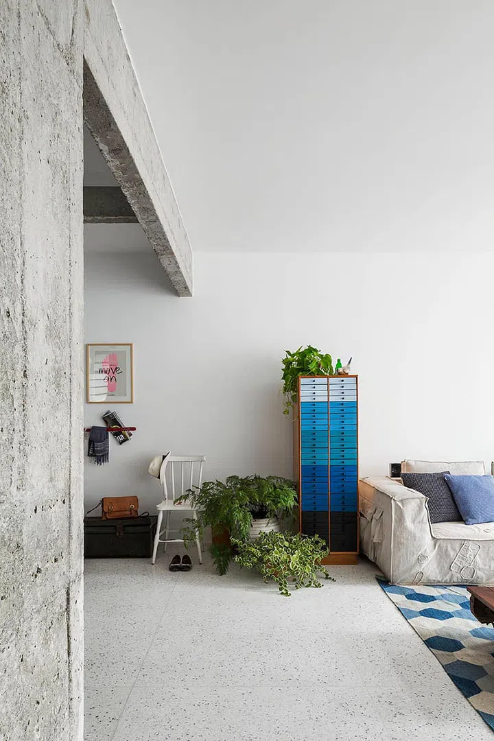 Despite the "plain" skeleton - made up of white walls and stone-look flooring - the house is vibrant with the homeowner's many knick knacks and loose furniture.