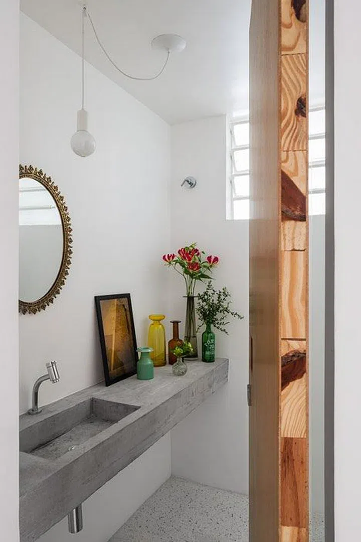 In the bathroom, colourful glass vases are an interesting addition to the concrete counter and sink.