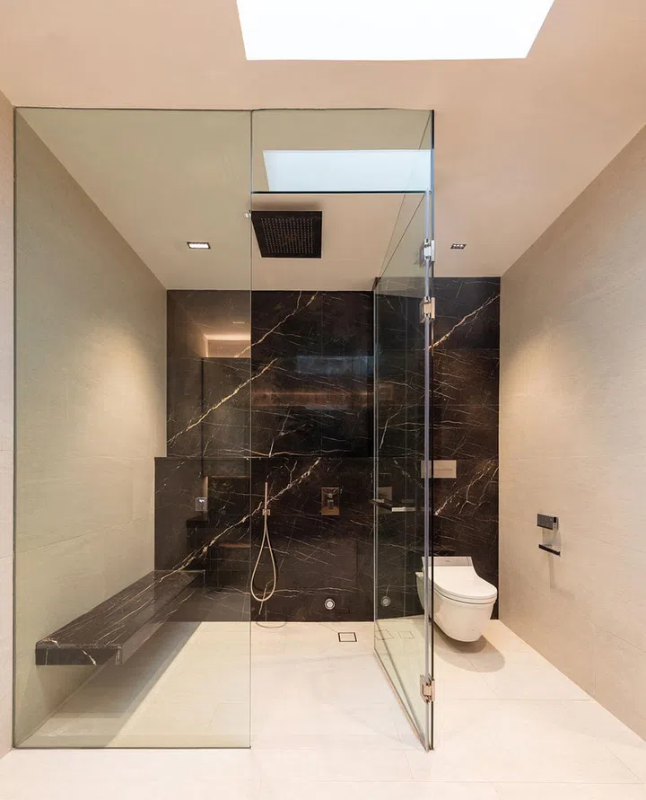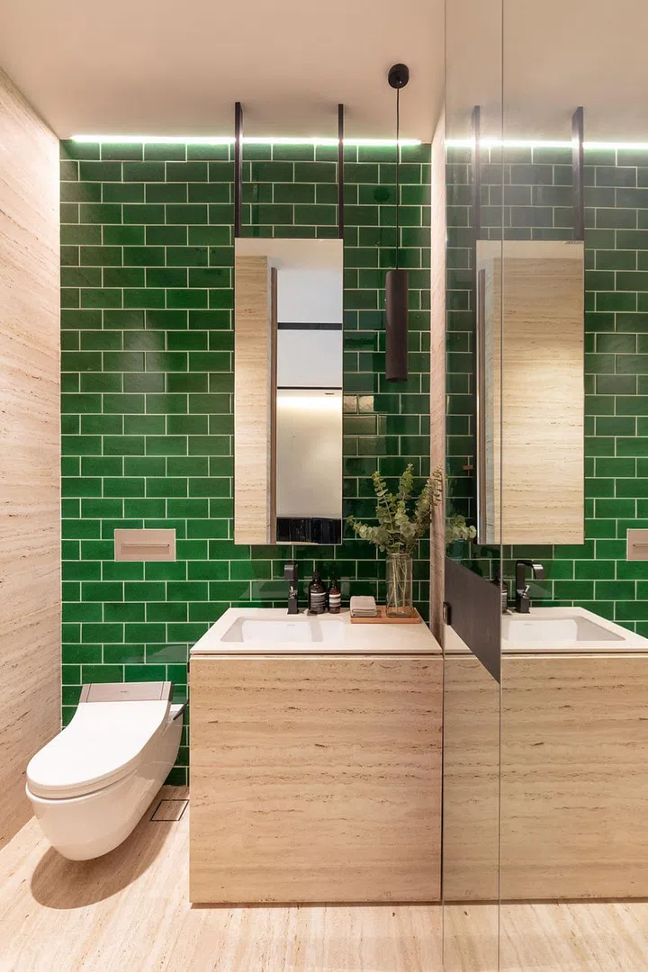 The powder room on the first level surprises guests with its handmade green wall tiles complemented by travertine on the side and provides contrast to the monochromatic colour scheme in the rest of the home.