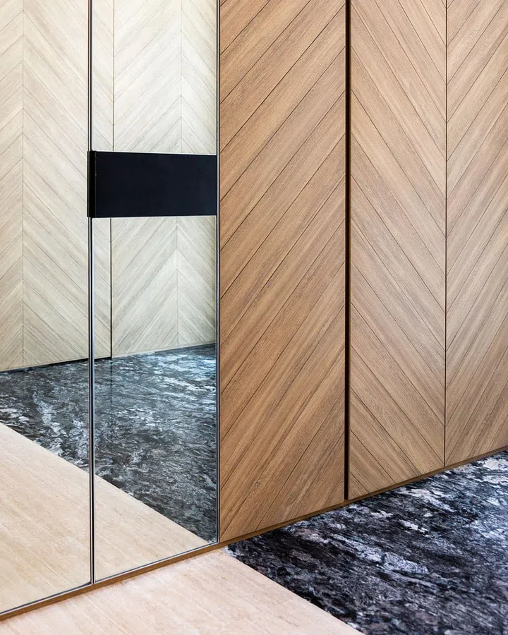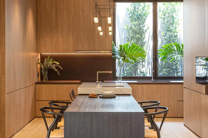 The designers moved the wet kitchen beside the dry kitchen, in place of an existing guest room. With some reconfiguration, they also managed to incorporate the helper’s room within this zone. “We added a sliding door in between the wet and dry kitchens to contain any grease and smoke, However, when it is opened, the kitchen counter effectively stretches the full length of both kitchens,” Shing Hui points out.