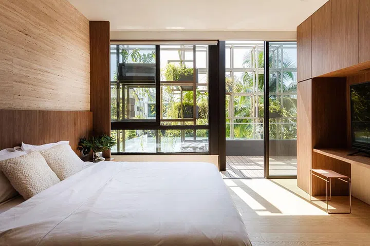 The highlight of the daughter’s bedroom, which overlooks the car porch, is a balcony where the animal lover can spend time with her cats and other pets. The room is located directly behind the facade’s planter boxes, so she can enjoy the greenery from both the balcony and within the room.
