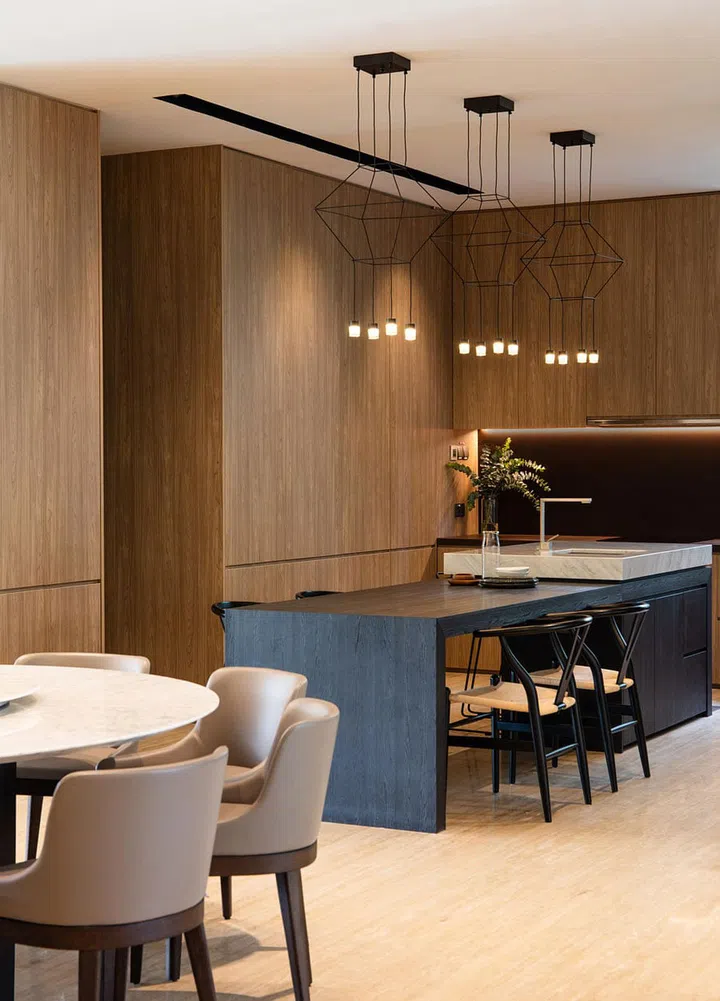The circular dining set sits 10 to 12 persons and was custom-made using one single slab of marble as per the client’s request. Light fittings were selected so as not to obstruct the vista across the home through to the pool and waterway.