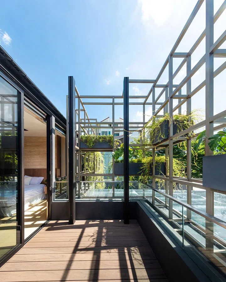 The facade is more than just the face of the home. It forms an amorphous boundary where the facade ends and the building edge begins. It was also conceived as a living grid that floats in front of the house, striking up a dialogue with the spaces behind it. As a response to our tropical climate, the green facade is like a skin that allows the fenestrations to be set back, thereby mitigating the effects of sun and rain.
