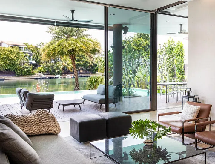 The elongated site and layout of the home lends itself to a spatial sequence that leads from the entrance and foyer to the dining area, stepping down to the living room and extending out towards the pool terrace and swimming pool, beyond which is the Sentosa Cove waterway.