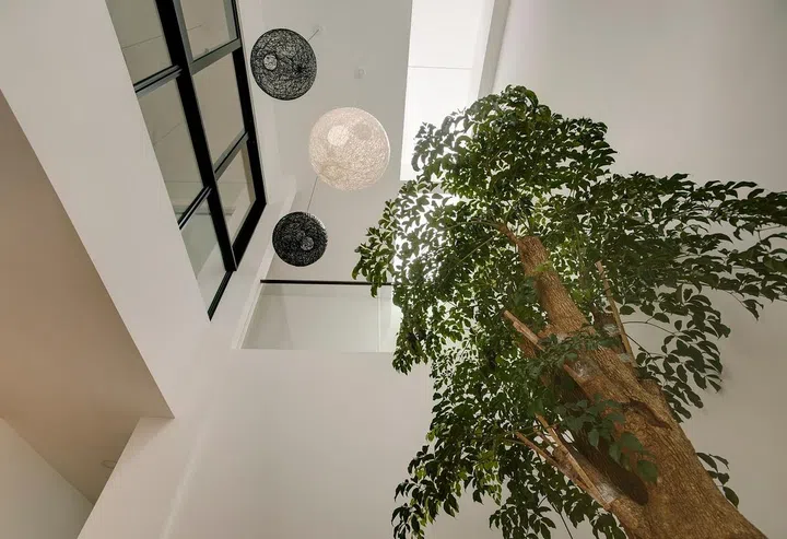 A large tree dominates the space in the centre of the house, drawing the eye upward to the skylight that floods the home with natural light. This central space serves as an area for family gatherings, and also visually connects the different parts of the house.
