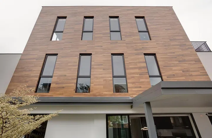 The idea of a cuboid exterior was conceptualized in order to camouflage the protruding beams and columns on the previous exterior. For the cladding, the homeowner chose tiles that resembled timber. The resulting look is both contemporary yet rustic, complemented by full-height windows that punctuate the exterior.