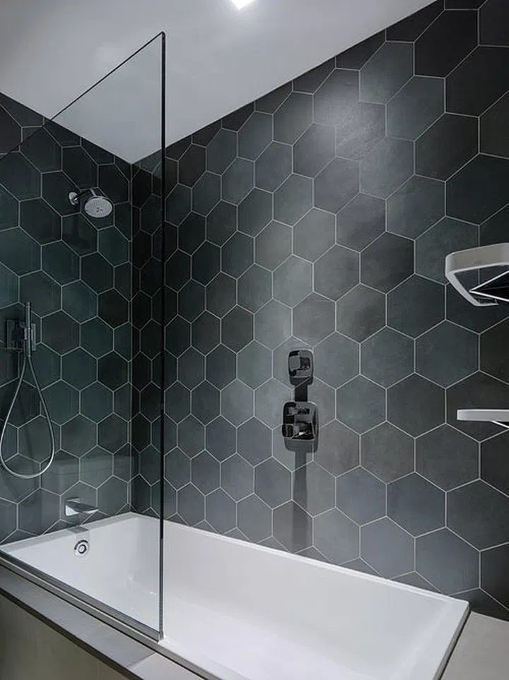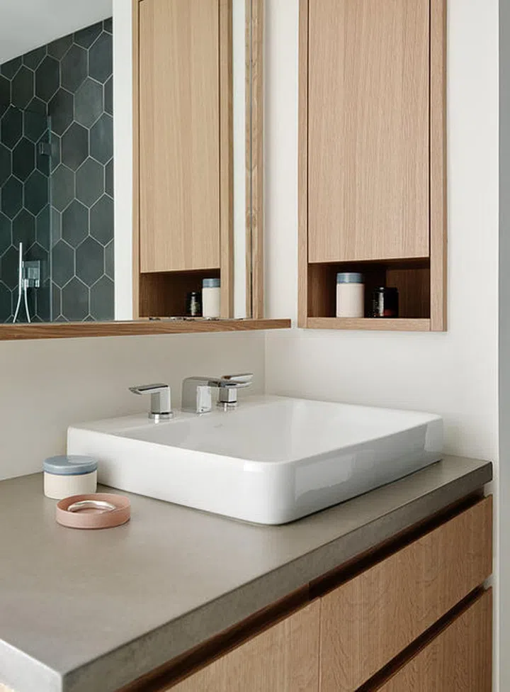 For a sense of continuity, the same geometric tiles in the kitchen were used in the bathroom as well.
