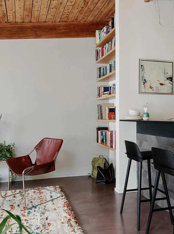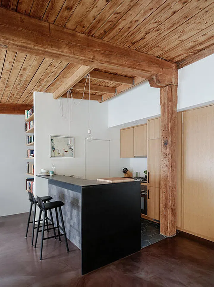 The dark polished concrete flooring, wood ceiling, and brick walls framing the windows of this loft apartment in the US make a beautiful and raw backdrop for its homeowners.