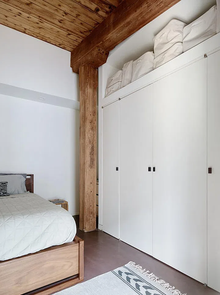 The mostly-white palette in the bedroom allow the characteristic wood grains to stand out.