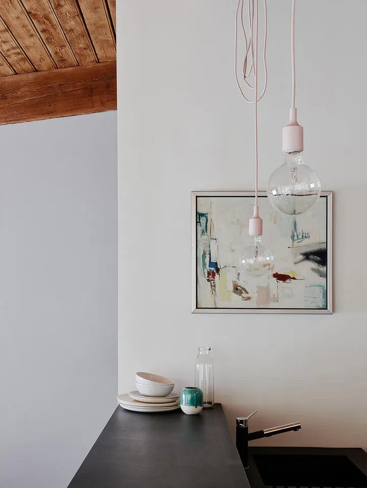 The home is decorated with contemporary style accessories like abstract paintings and industrial-style lamps.